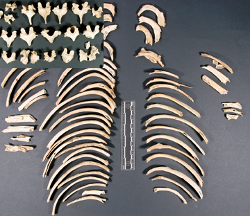 Einer der hervorstechendsten Aspekte von Komplex 9 (und dies trifft für die ganze Anlage zu) ist das Erscheinungsbild der menschlichen Knochen. Neben der Sonderbehandlung der Schädel, die größtenteils zu Kalotten zugerichtet worden waren (Abb. 4) – und deshalb gleich zu Beginn der Ausgrabungen 1996 große Aufmerksamkeit auf sich gezogen hatten –waren aber auch alle vorhandenen Teile des postcranialen Skelettes der hier niedergelegten Toten einer speziellen, bei regulären Bestattungen nicht üblichen Behandlung unterzogen worden. Gerade die Zurichtung und Manipulation der verschiedenen Skelettelemente stand bei den Untersuchungen von Bruno Boulestin im Mittelpunkt.